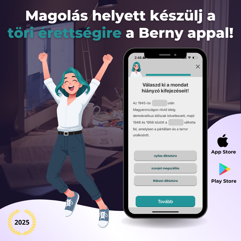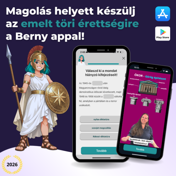 - Eredményközpontú: A Berny app-on belül biztosan azt kapod, amire szükséged van! A tananyagot 3 tapasztalt tanár közösen állította össze, azzal a céllal hogy semmilyen felesleges sallang ne legyen benne csak a lényeg.
