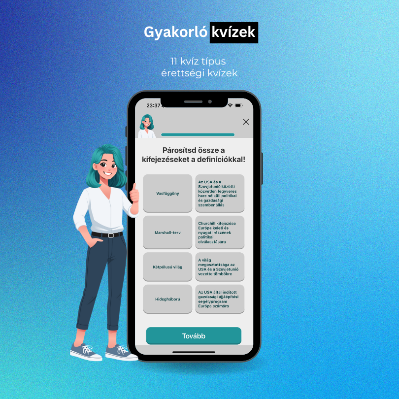 - Ismétléses gyakorlás: Miután megnézted a videót és elolvastad a szöveget, jöhet a gyakorlás! Az applikációban 11 féle kvíztípussal találkozhatsz (képekkel, párosítással, szöveg beillesztéssel, igaz-hamissal…) így mire a feladat végére érsz már pontosan el fogod tudni helyezni időben és térben az eseményeket és az érettségi változó feladattípusai sem fognak elbizonytalanítani.