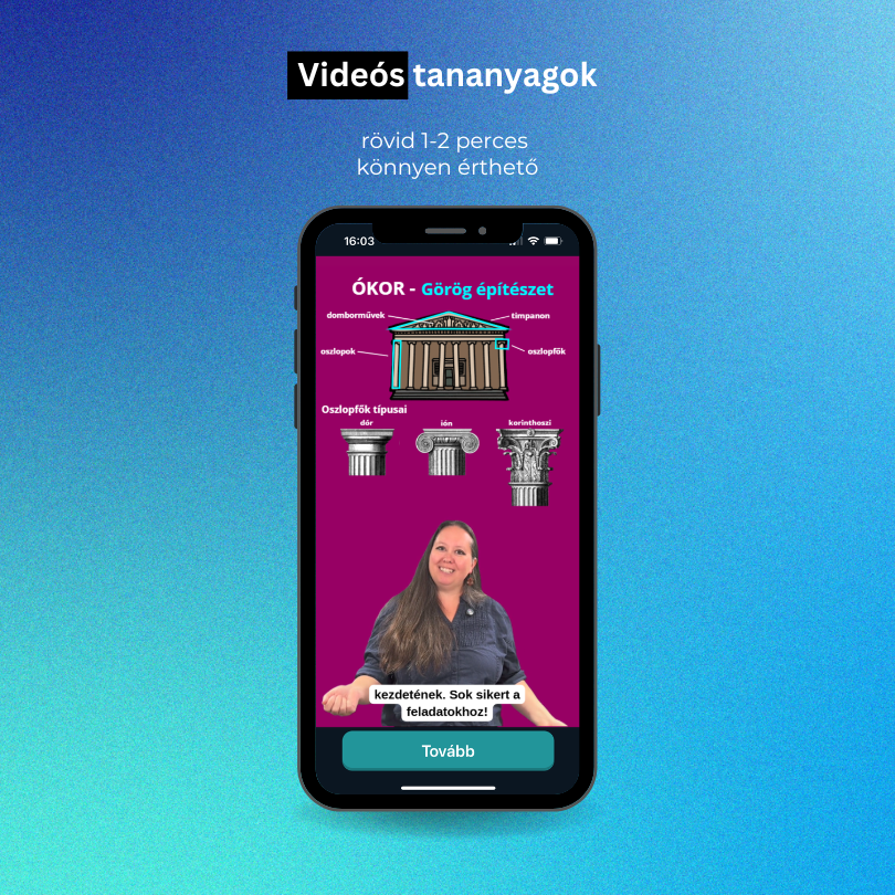- Hatékony tanulás: Minden kis témán belül találsz egy rövid, 1-2 perces összefoglaló videót, ahol a legfontosabb logikai összefüggéseket és eseményeket magyarázzuk el. A videók ikonokkal és grafikákkal segítik a tananyag megértését és a hosszú távú felidézhetőséget (memorizálást).